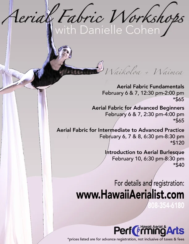 Have a specific trick or skill that needs work? Want to work on lyra or aerial hammock (sling)? Or just need a little more time with Danielle to work on skills learned during the workshop? Danielle will be available for private and semi-private coaching on fabric, lyra and aerial hammock/sling. Please call for details and scheduling options 808-354-6180.